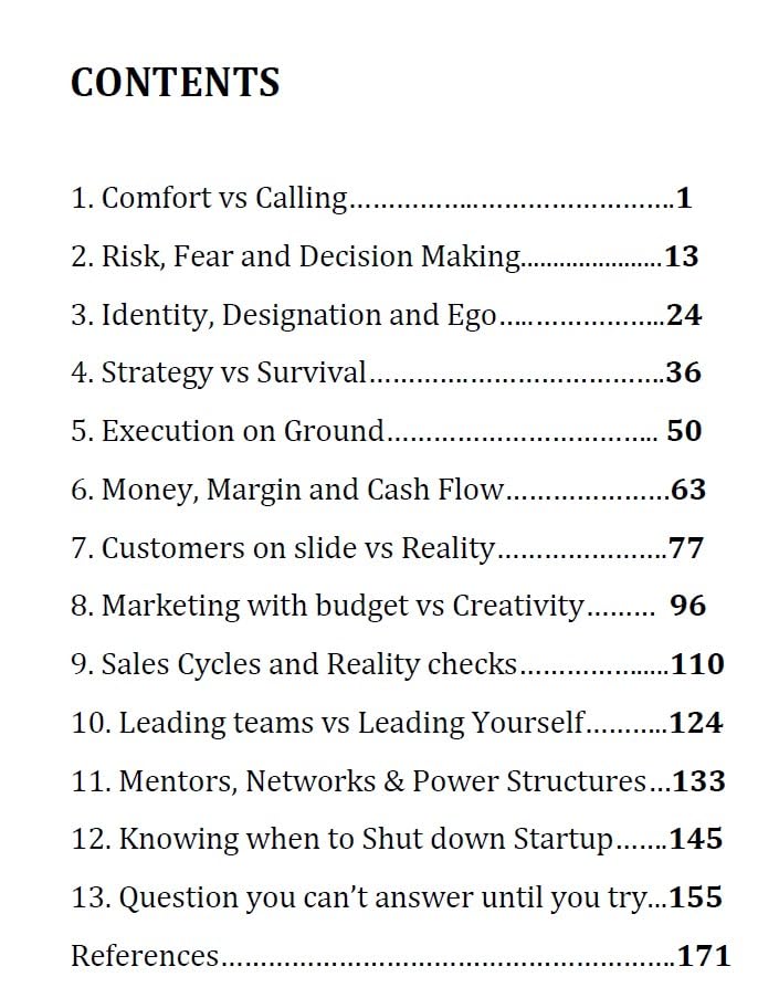 The third assumption and this one is cultural in India specifically is that returning to corporate after a startup failure is easy. It is not. I say in the book quite plainly: you can always go back. Entrepreneurship isn’t a one-way door. You will return with skills that corporate executives don’t have, startup experience, resourcefulness, the ability to function without structure. The problem, honestly, is that Indian corporates don’t yet value this. My own months of job search (over a year) after closing Grewind confirmed that. But I believe that gap is closing, and I believe people with genuine startup experience are undervalued in our hiring market right now.