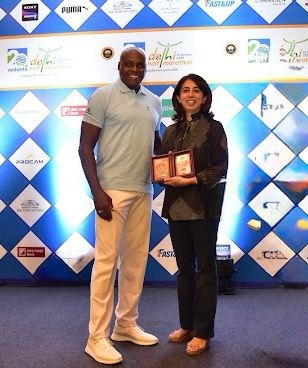 Rashmi Mohanty Felicitated by Carl Lewis for Completing 15 Delhi Half Marathons