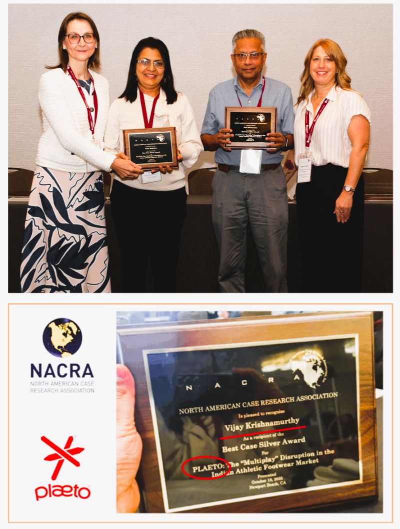 We are pleased to congratulate alumnus Ravi Kallayil (PGP 1994), Co-Founder of Plaeto, on the recognition received by the case “PLAETO: The ‘Multiplay’ Disruption in the Indian Athletic Footwear Market,” which has been awarded the Silver Award at the 2025 North American Case Research Association (NACRA) Conference. The case was co-authored by Prof. Ram Subramanian, Dr. Sonia Mehrotra and fellow collaborators, with Ravi featured as the case protagonist.